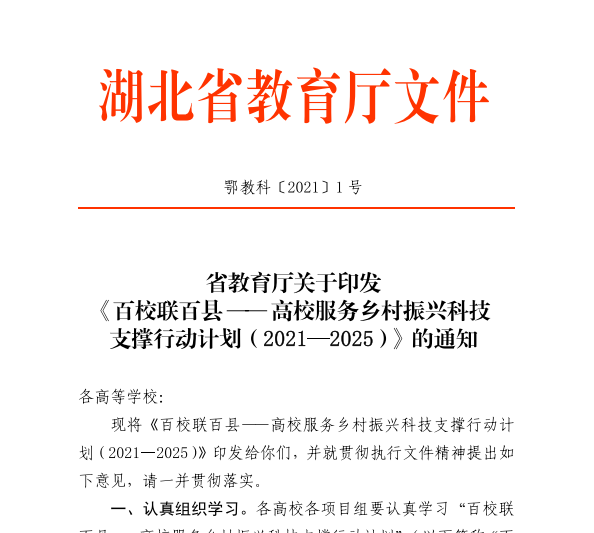 近日,湖北省教育厅下发《省教育厅关于印发百校联百县—高校服务乡村振兴科技支撑行动计划(2021-2025)的通知》(鄂教科【2021】1号)文件。我校管用才、傅强等7位教师8个项目喜获立项。
