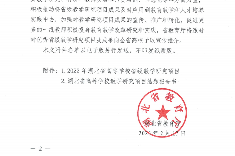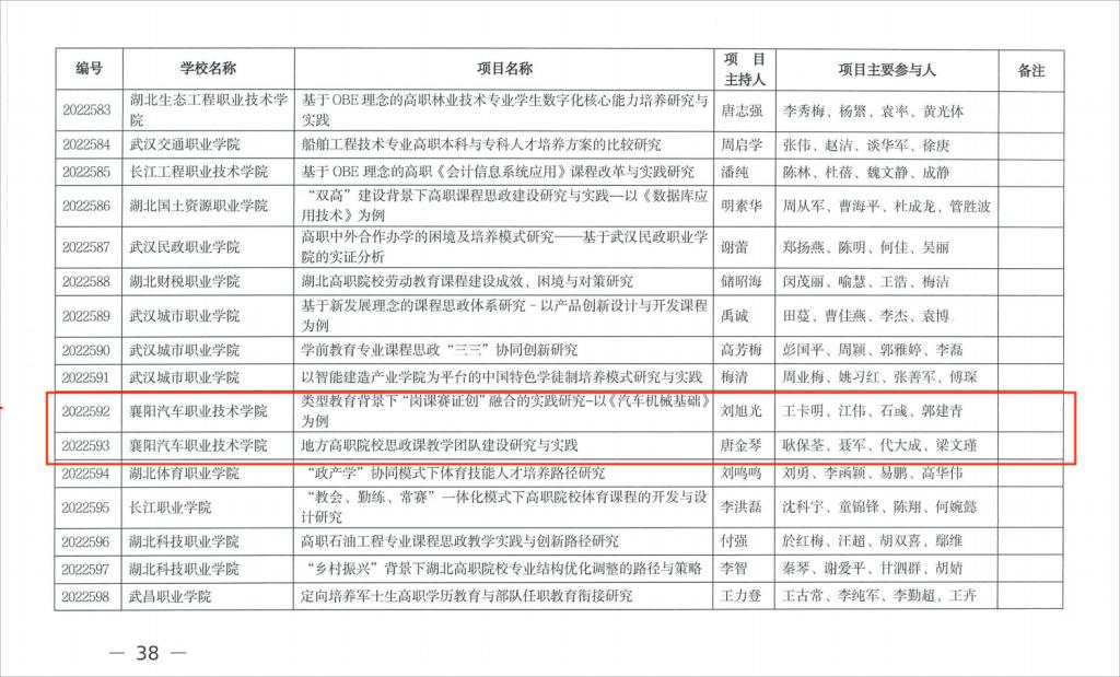 (通讯员:左小勇)日前,省教育厅公布2022年湖北高校省级教学研究项目,襄阳汽车职业学院《类型教育背景下“岗课赛证创”融合的实践研究-以《汽车机械基础》为例》和《高职院校思政课教学团队建设研究与实践》2项课题成功立项。