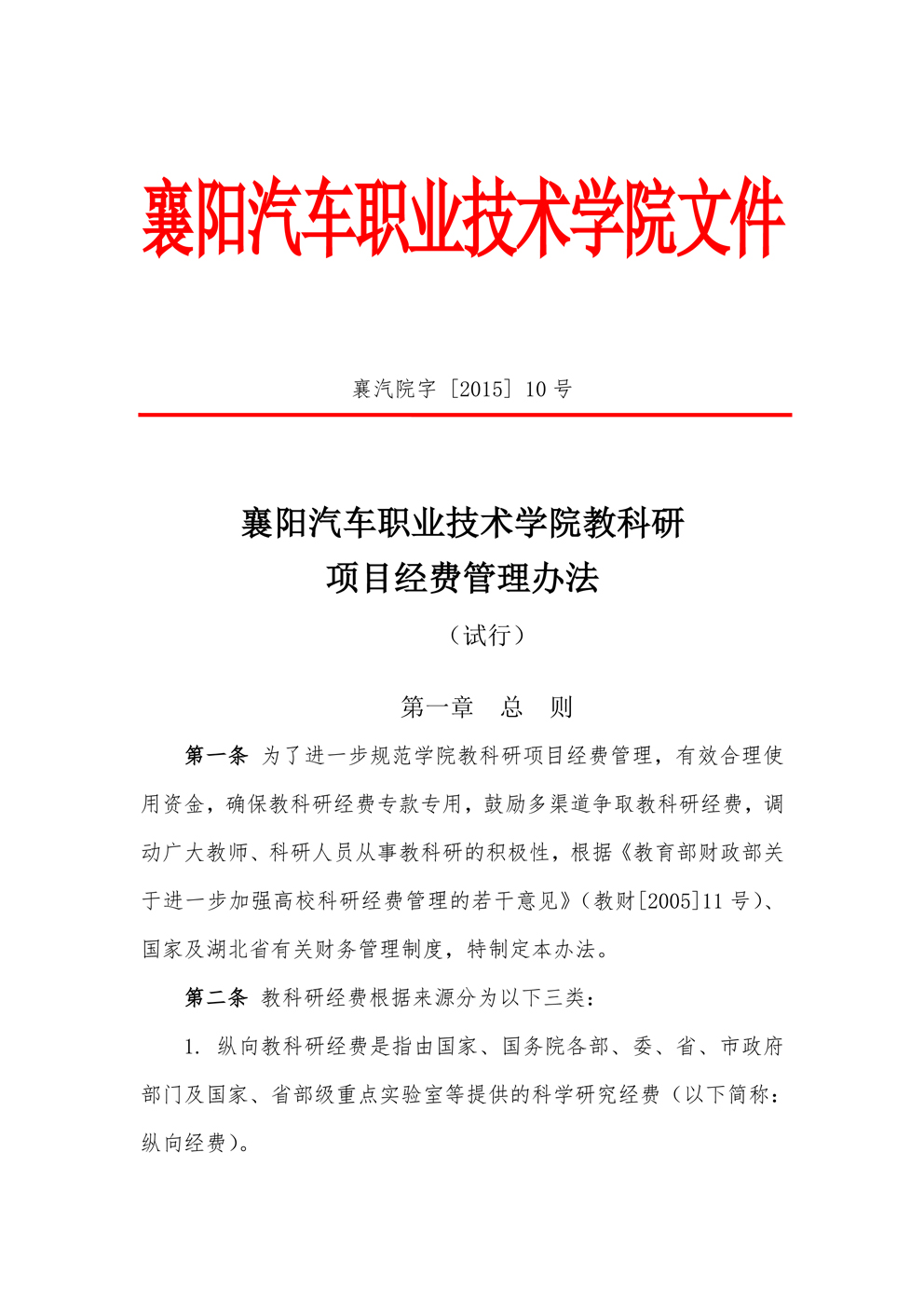 襄阳汽车职业技术学院教科研项目经费管理办法